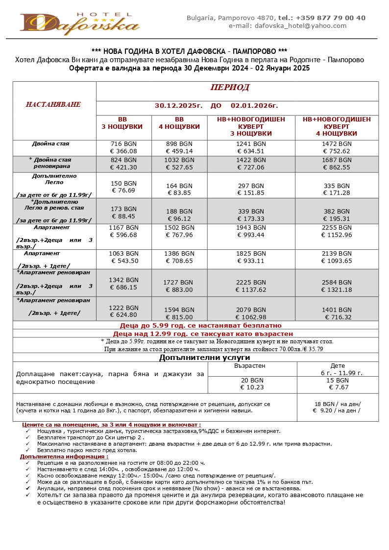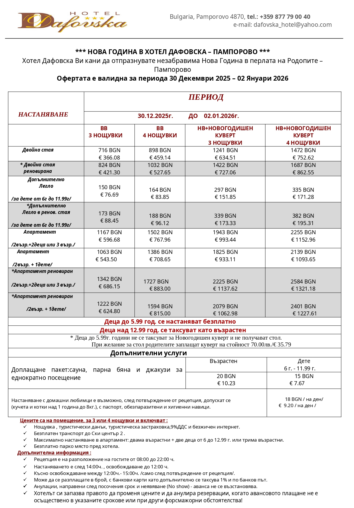 30 Декември 2025 – 02 Януари 2026 РАЗПОЗНАЙТЕ СЕ С НАШИЯ ЦЕНОРАЗПИСЗА НАСТАНЯВАНЕ ПРЕЗ ПЕРИОДА ПОСОЧЕН ОТ ВАС